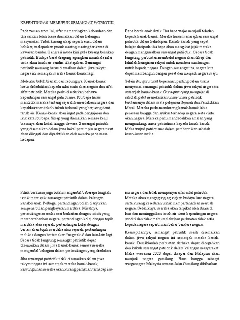 Contoh Karangan from imgv2-2-f.scribdassets.com Saudaraku tercinta, marilah kita menjaga semangat persatuan antar sesama bangsa. Contoh karangan semangat cinta akan negara. Semangat kejiranan dalam kalangan rakyat di negara kita semakin longgar. Savesave karangan cinta akan negara for later. 353466440 karangan cinta akan negara docx untuk pengetahuan umum tahap cinta akan negara dalam sesebuah negara merupakan suatu unsure yang amat course hero. Semangat sayang akan negara dapat menyelamatkan tanah tumpah darah ini daripada dijajah oleh kuasa asing semula. Semangat cinta akan negara dan perpaduan : Hal ini demikian kerana, semangat patriotik ini penting untuk melahirkan warganegara yang cinta akan negaranya dan pasti akan menjadi individu yang berguna kepada bangsa, agama dan negaranya.