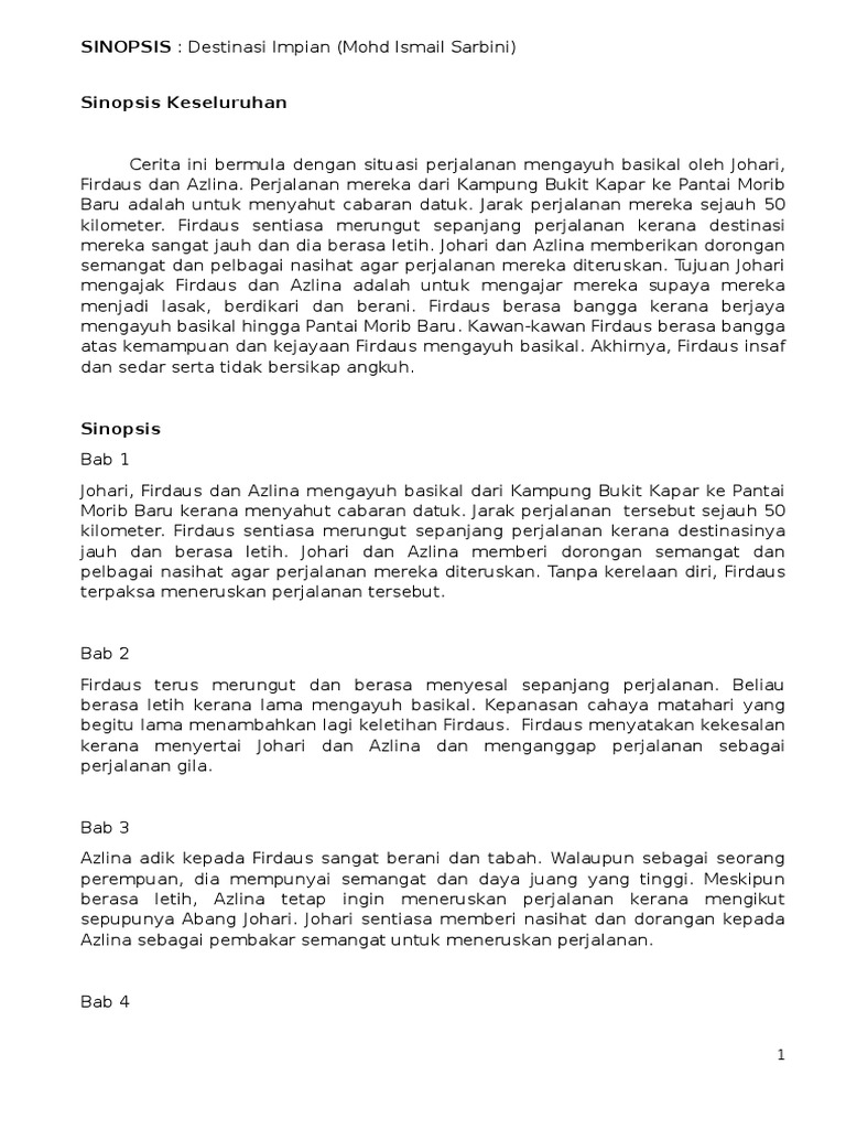 311935607 Novel Destinasi Impian Tingkatan 1 from imgv2-2-f.scribdassets.com Azlina seorang perempuan berumur 16 tahun, pelajar tingkatan 4 sanggup menerima cabaran untuk mengayuh basikal sejauh 50 kilometer. Berdasarkan novel, destinasi impian karya mohd ismail bin sarbini terdapat beberapa persoalan dipaparkan dalam novel ini. Pengarang novel ini mendapat pendidikan awal di klang sebelum melanjutkan pelajaran di maktab. Persoalan usaha dan kerjasama menghasilkan kejayaan contoh: Novel destinasi impian other contents. Destinasi impian karya mohd ismail sarbini. Mereka ingin membuktikan kepada datuk mereka bahawa mereka juga boleh berbasikal ke morib seperti yang pernah dilakukan oleh datuk. Firdaus seorang individu yang berada dalam keadaan dicabar dan mencabar.